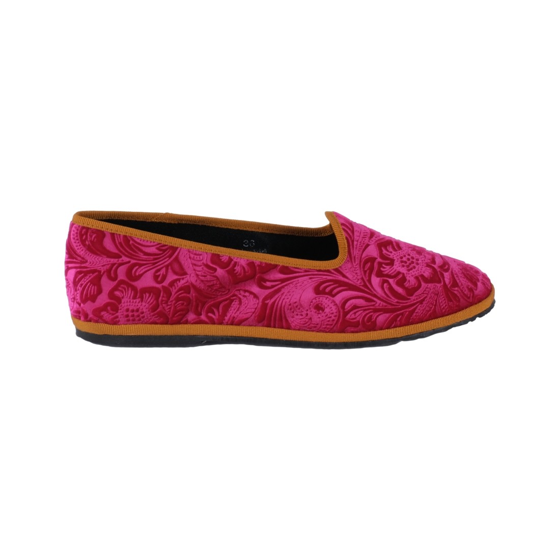 Pantofole Friulane eco-compatibile, fatte a mano.velluto di cotone misto viscosa, stampa floreale, trattamento idrorepellente e antimacchia.Profili: grosgrain arancione. Fodera: 100% cotone.