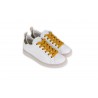 Scarpe allacciate con tomaia in nappa riciclata di colore bianco, lacci colorati a trama larga e spoiler in suede sostenibile colorato. La linea P01 Original presenta linee pulite in perfetto equilibrio fra design e comfort.